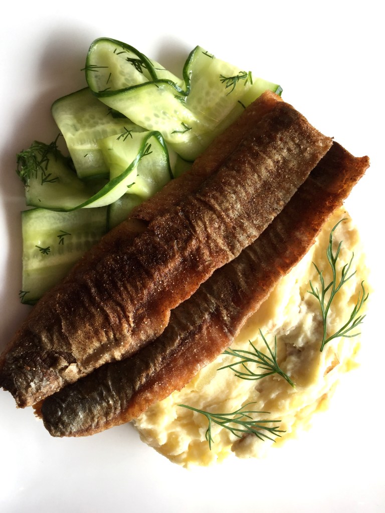 Serve with mashed potatoes and sweet dill cucumber pickles (pressgurka).