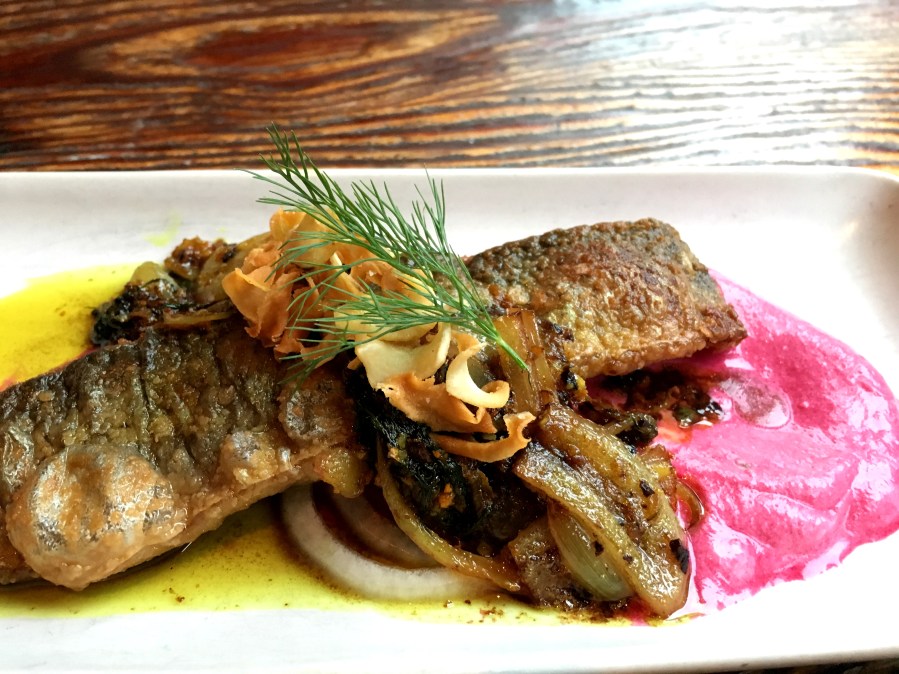 Introducing Pan-Fried Herring on silky beet crema, topped with crispy-fried horseradish and fresh dill from Terra Plata, on Capitol Hill, for Alaska Herring Week 2017!