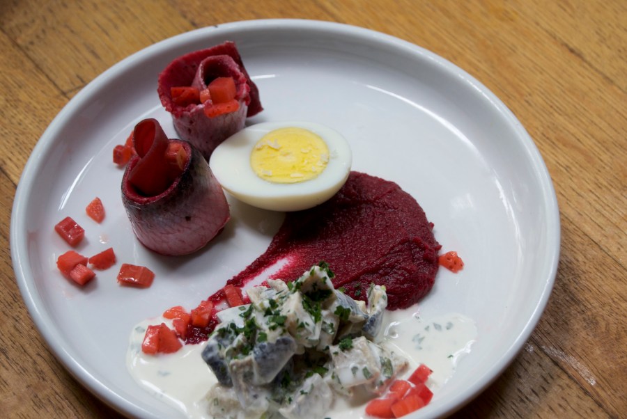 Herringsalat. Beet pickled herring, quark marinated herring, beet sauerkraut puree, strawberry and rhubarb pickles, egg from Altstadt for Alaska Herring Week 2017! Photo courtesy Altstadt.