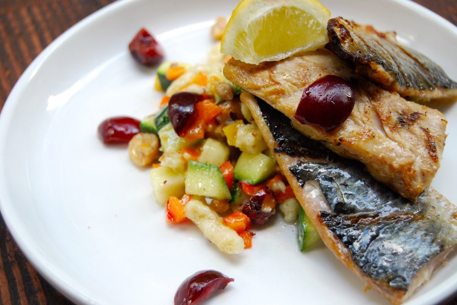 Steckerlfisch. Grilled smoked herb oil marinated herring, zucchini hazelnut spätzle salad with sage vinaigrette, pickled cherries from Altstadt for Alaska Herring Week 2017! Photo courtesy Altstadt!