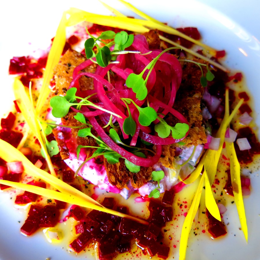Pickled Alaska Herring Panzanella with roasted beets, micro arugula and sweet corn shoots from Orfeo for Alaska Herring Week 2017!