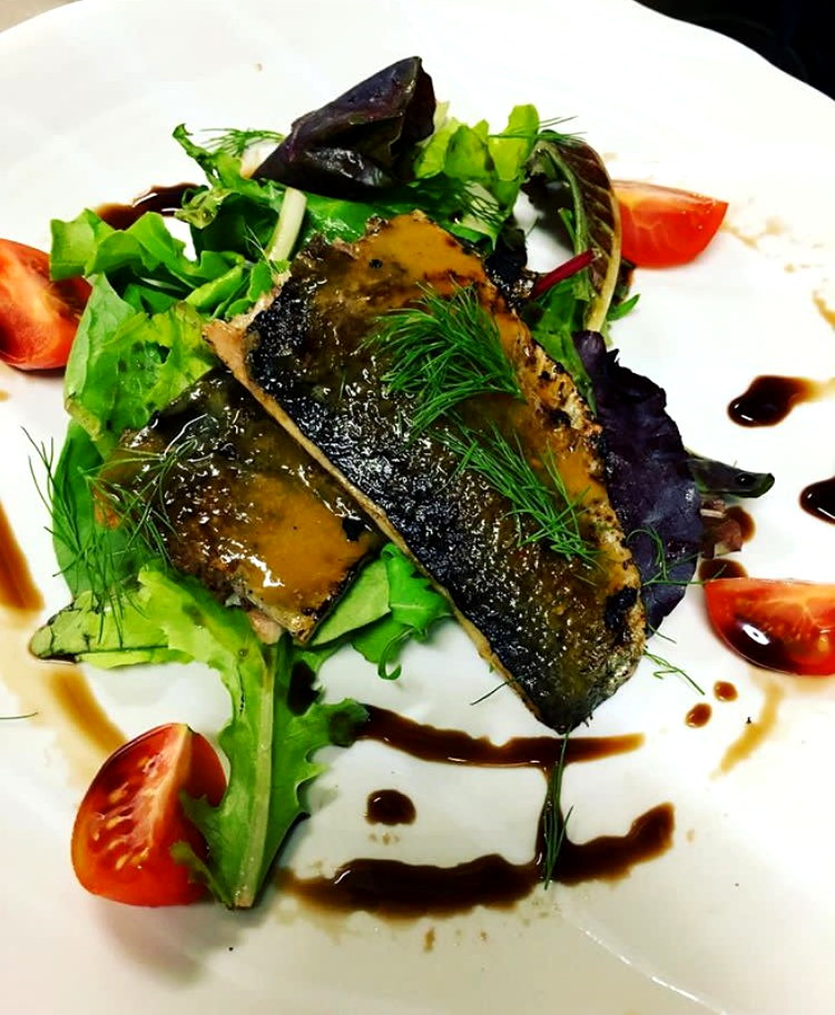 Plate your ingredients in whatever whimsical fashion you desire but we suggest stacking from bottom to top the veg, fish, and then relish.