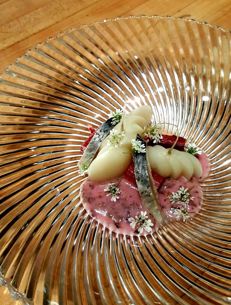 Herring smoked over hazelnut shells, turnips and rhubarb from the garden, and a vinaigrette loaded with shiso, lovage and flowering coriander from The Herbfarm for Alaska Herring Week 2017! Photo courtesy The Herbfarm.